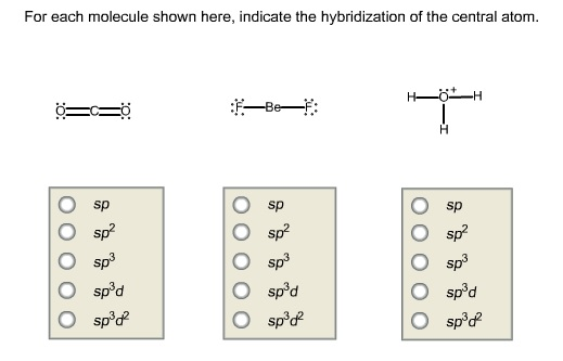 What Is The Hybridization Of The Central Atom In Tecl2. The hybridization for the blue oxygen atom will be sp2, the green oxygen atom will be sp2 and the red oxygen atom will be sp3. What is the hybridization of the central atom in each of the following: