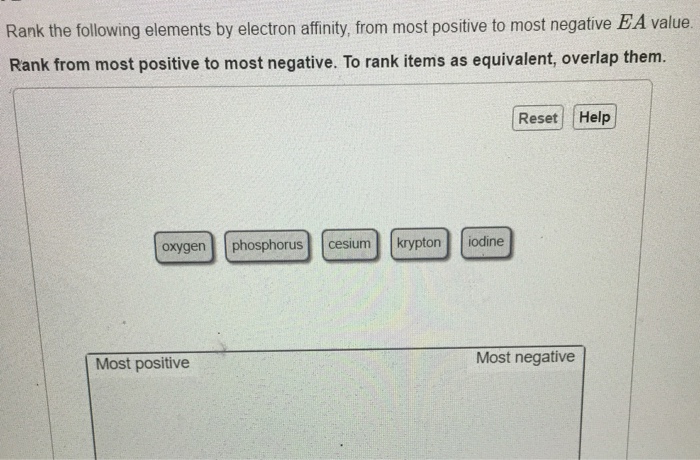 Rank from most positive to most negative. To rank items as equivalent, overlap them. 2 📌📌📌 question rank the following elements by electron affinity, from most positive to most negative ea value.