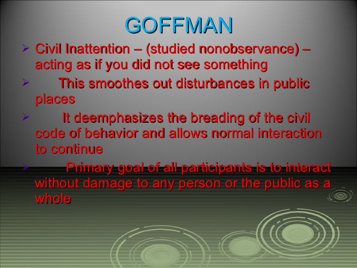 Civil inattention is defined as the process whereby an individual demonstrates to another individual that they are within each other’s presence, for example: In modern western societies,2civil inattention is a norm that fosters privacy within public spaces. Most encounters between strangers in urban public spaces involve the ritual of civil inattention (goffman 1963).