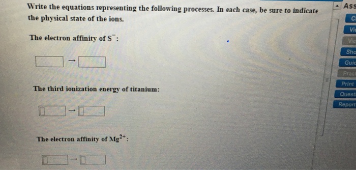 You would write a reaction that therefore involves the release of an electron from the atom and the absorption of energy into the atom. A) s(g) + e− → s−(g) c) s(g) → s+(g) + e− b) s−(g) + e− → s2−(g) d) s−(g) → s(g) + e− e) s2−(g) → s−(g) + e− I rate constant k ii activation energy ea.