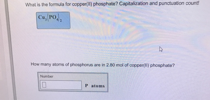 A different preparation involves reacting copper carbonate with phosphoric acid: How many atoms of phosphorus are in 2.30 mol of copper(ii) phosphate? If you are having trouble with chemistry, organic, physics, calculus, or statistics, we got your back!